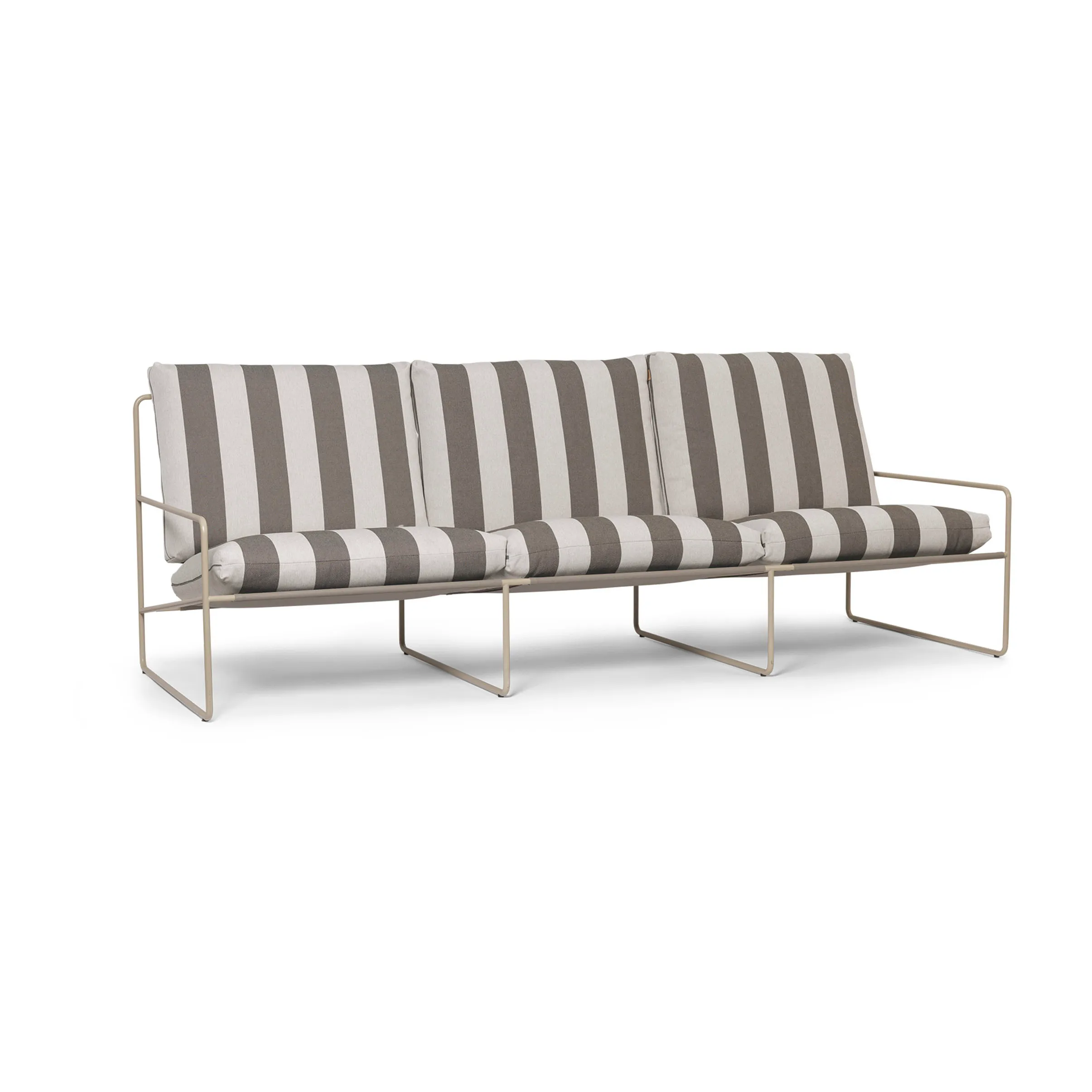 Das Desert 3-Sitzer-Sofa des dänischen Unternehmens Ferm Living besteht aus pulverbeschichtetem Stahl mit einem bequemen und strapazierfähigen Kissen aus einer Mischung aus Vinyl und Polyester. Das Desert Sofa bietet einen bequemen Platz, um ein Buch zu lesen, Freunde und Familie zu unterhalten oder einen Drink in der Abendsonne zu genießen. Mit Blick auf das unberechenbare Wetter in Skandinavien ist die Desert-Serie für den Außenbereich konzipiert und wird durch gemütliche Kissen ergänzt, die sowohl wasser- als auch UV-beständig sind.